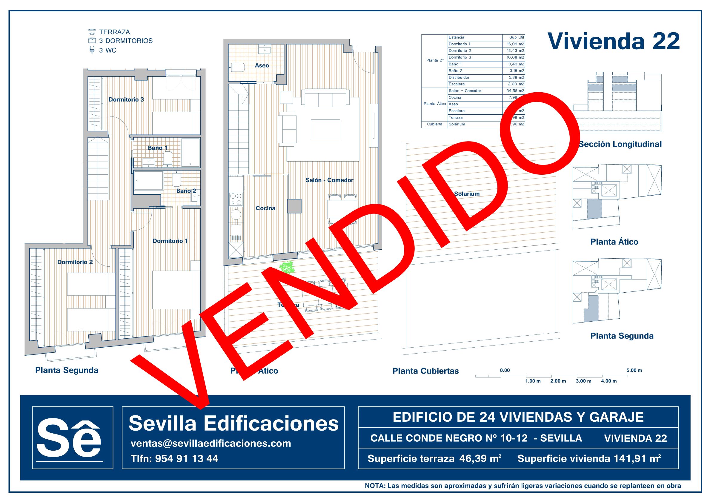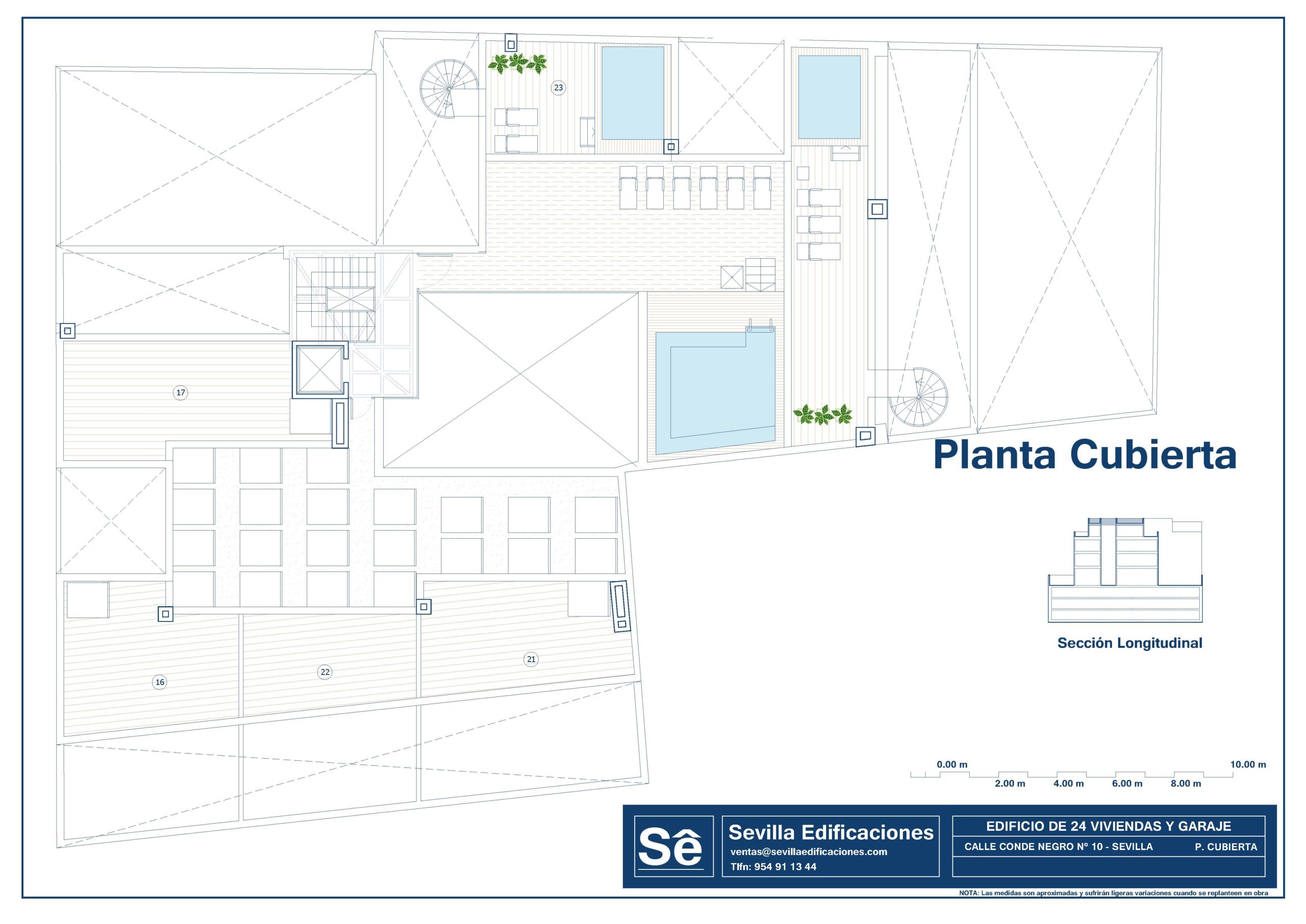 Los pisos de la planta baja tienen el uso privado de los patios, con la posibilidad de instalación de piscina propia y techos altos con más de 4,00 metros. Los áticos tienen terraza privada, también con la posibilidad de instalación de piscina y además la posibilidad de acceso a los castilletes a través de una escalera de caracol para utilizarlos como mirador, con unas grandes vistas de Sevilla.